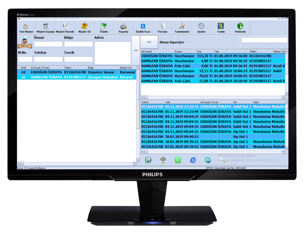 Sipariş sürecini hızlandıran sipariş takip programı işletmenizi büyük bir iş yükünden kurtaracaktır. İşletmeler bu sistem ile profesyonel hizmetler sağlamaktadır. Ana ekranda kayıtlı müşterileri görebileceğiniz bir kısım yer alıyor. Alınan siparişler kısmında ise aktif durumda olan siparişleri görebiliyorsunuz. Ekranın alt kısmında ise gelen aramaları takip edebilirsiniz.