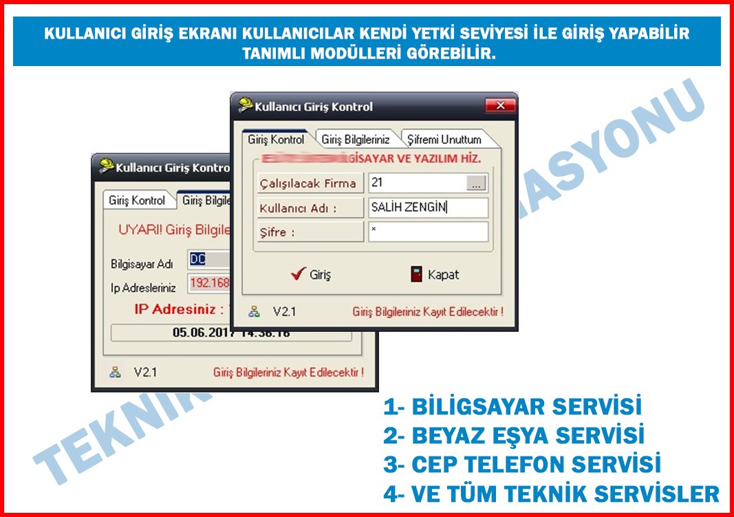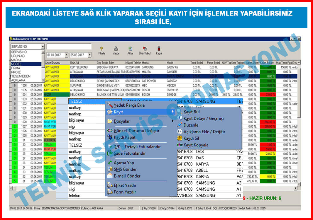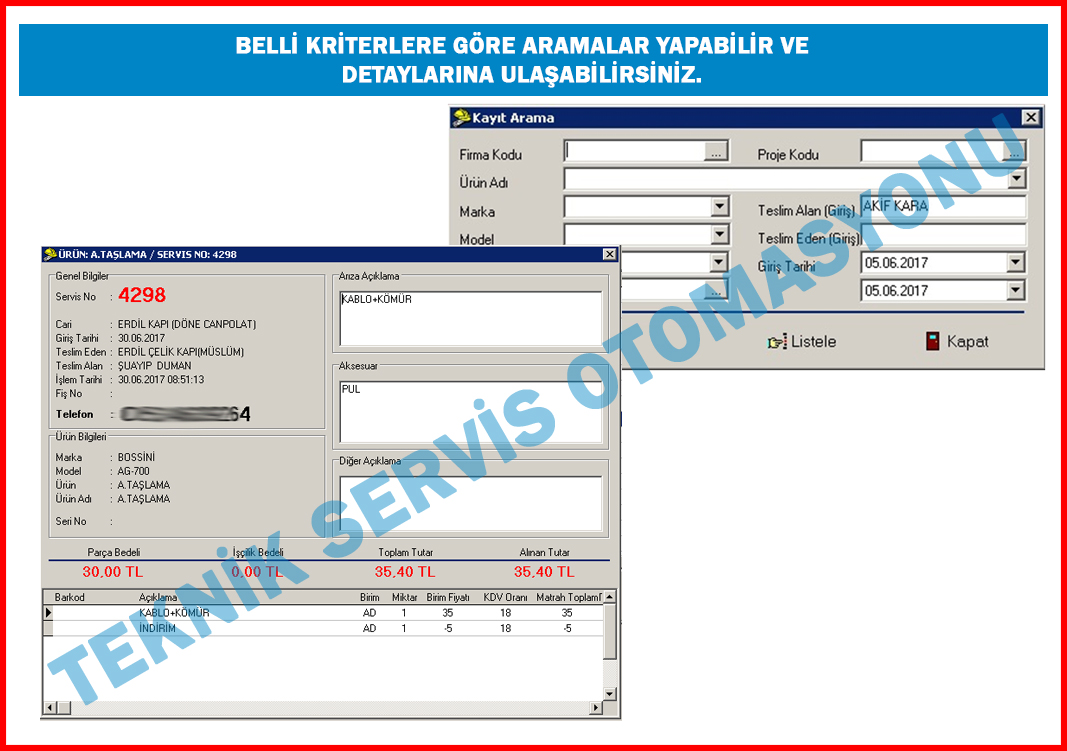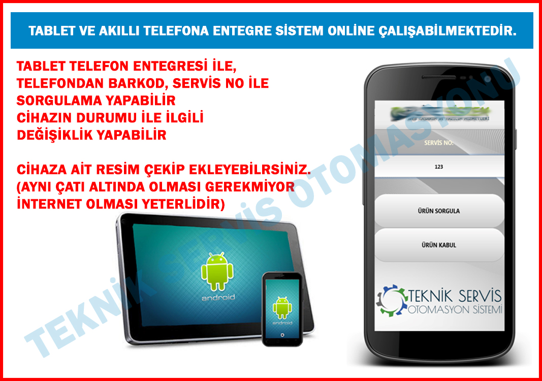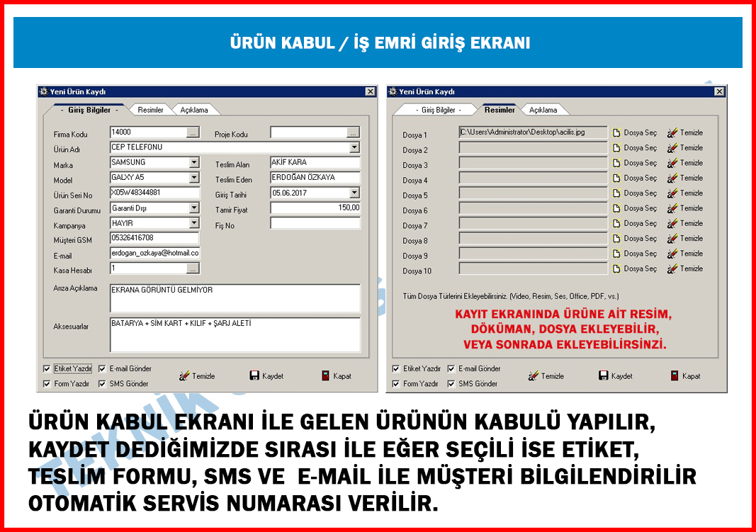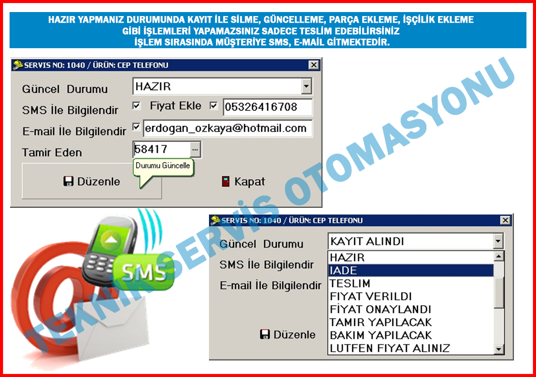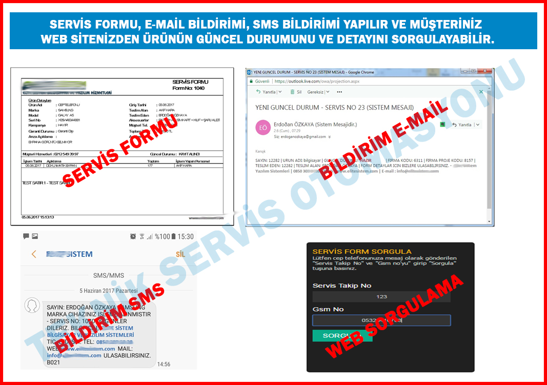 Programda SMS ve E-mail Sistemi ile müşterilerinizi otomatik bilgilendirme sistemi mevcuttur ve aynı zamanda web sitenize entegre ederek müşterileriniz cihazının durumunu online olarak görüntüleyebilirsiniz
